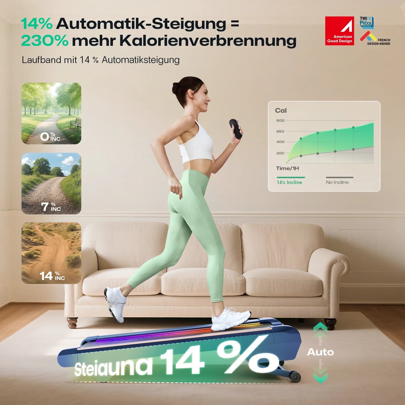 - Dynamische 14 % Steigung: Die MegaLift-Technologie ermöglicht Steigungen bis 14 %, die die Kalorienverbrennung um 190 % steigern – für schnelle Trainingserfolge.