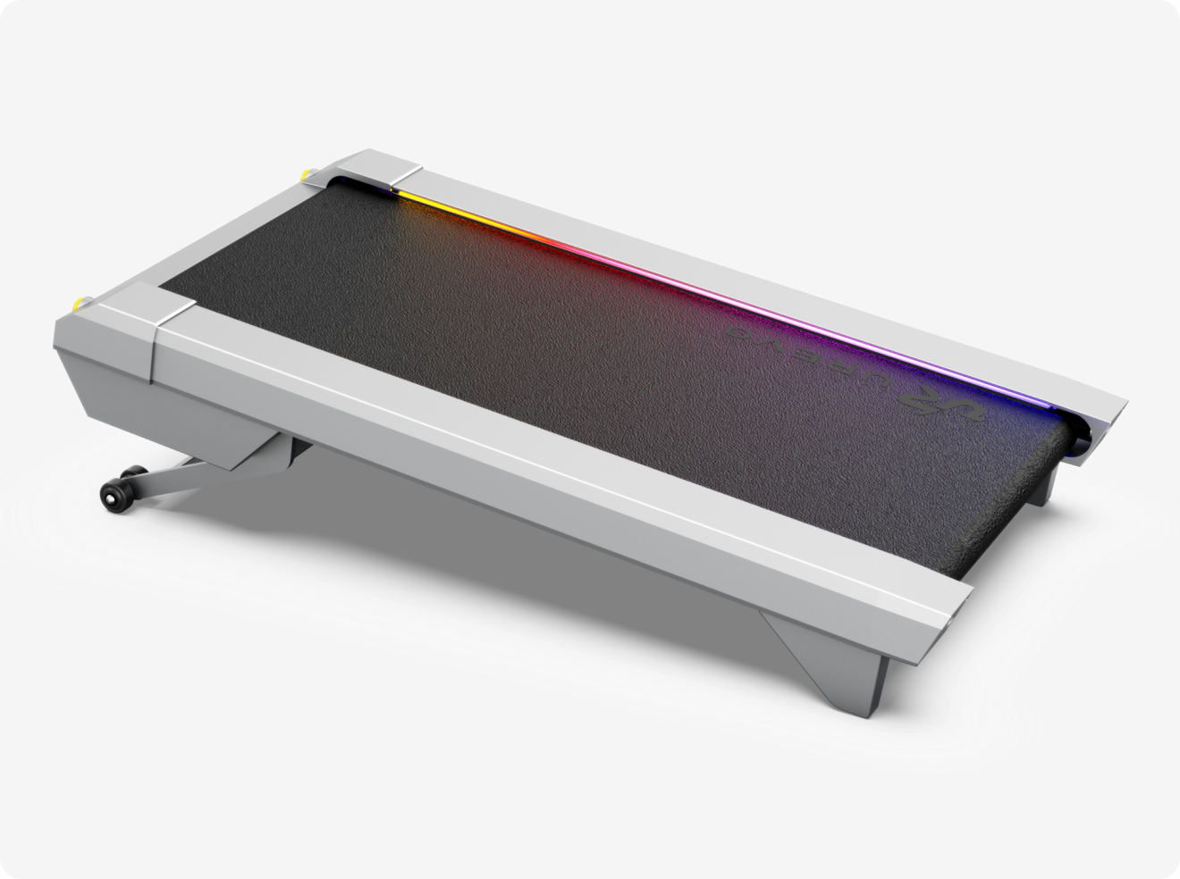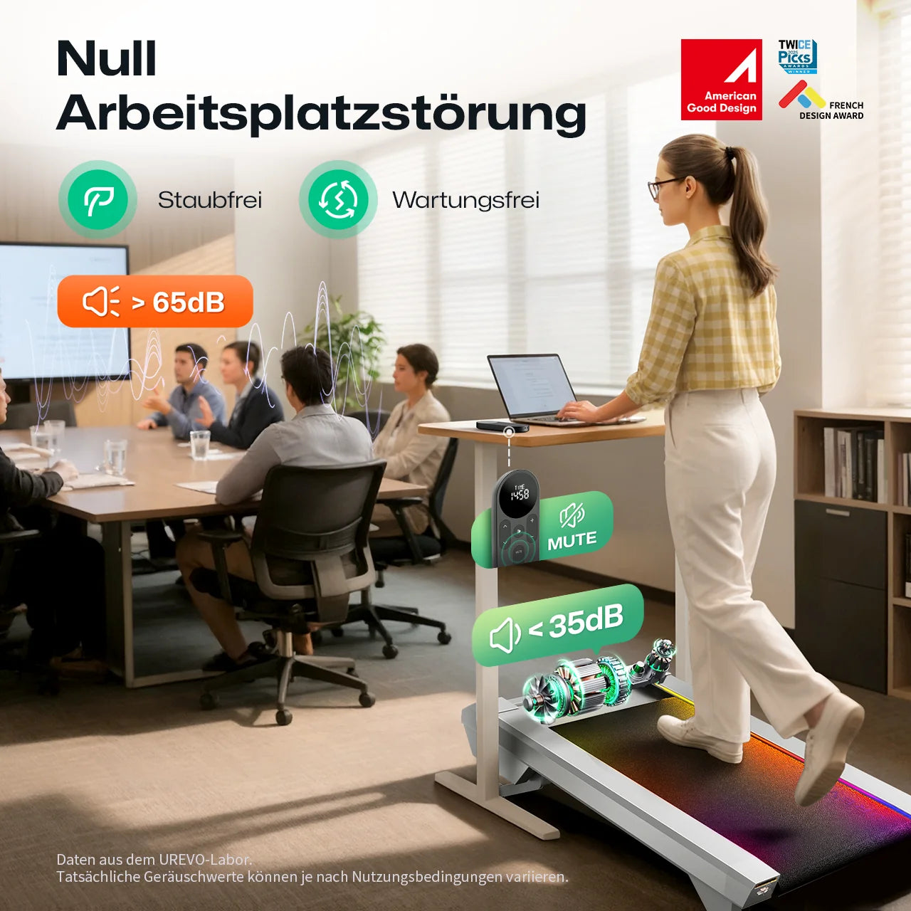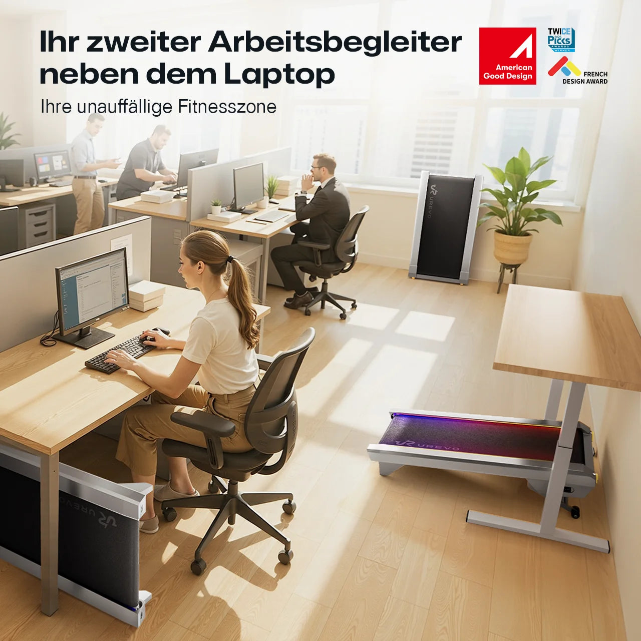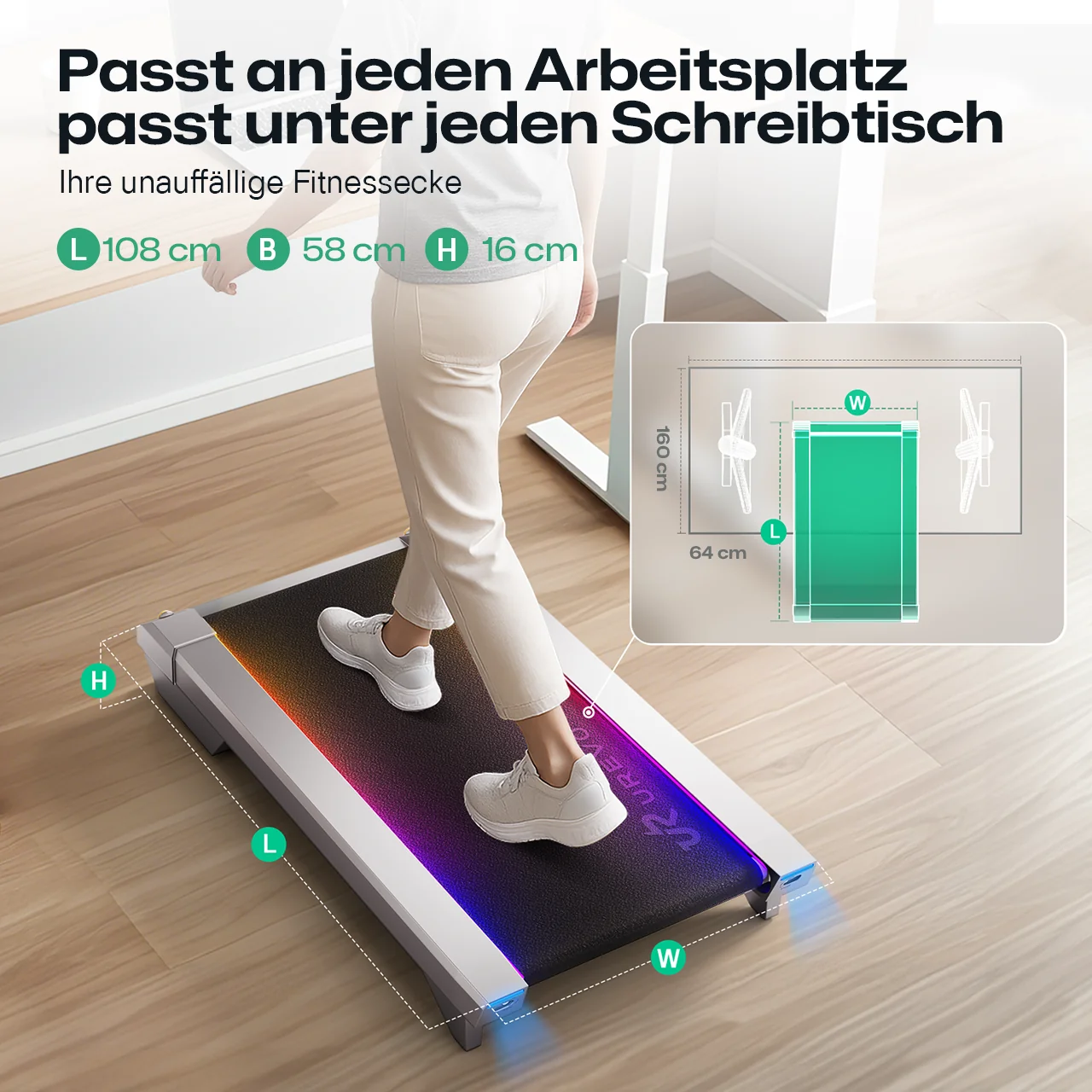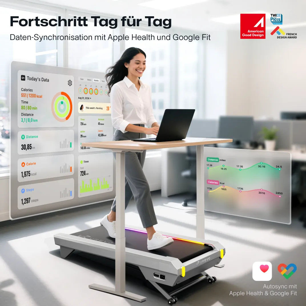 Offenes Frontdesign für Arbeitswelten: Gehen während Telefonaten, Dehnen zwischen E-Mails – auf Ihrem ultraflachen Laufband, das unter jedem Schreibtisch verschwindet. Industrie-lowest Profile mit 100 cm sicherer Lauffläche für natürliche Bewegung im Arbeitsumfeld.