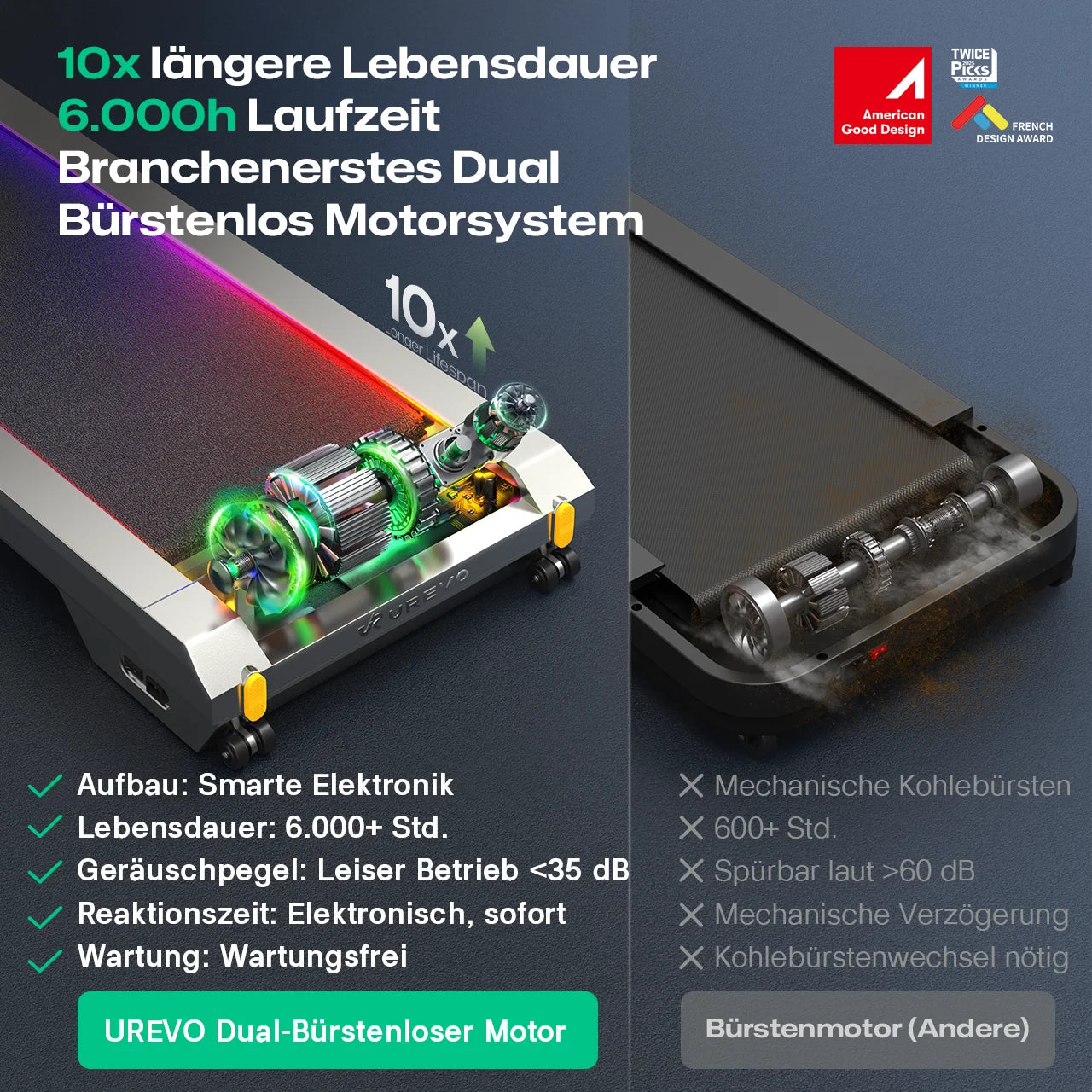 2-fache Power, Ultra-Leise: Mit Doppel-Bürstenlosmotor-System bietet dieses Walking-Pad echte Profi-Leistung (2,5 PS) – doppelter Output gegenüber Standard-Heimgeräten. Durch UREVO-Labortests erreichen wir flüsterleise 45 dB – kein Störfaktor für Mitbewohner oder Nachbarn..
