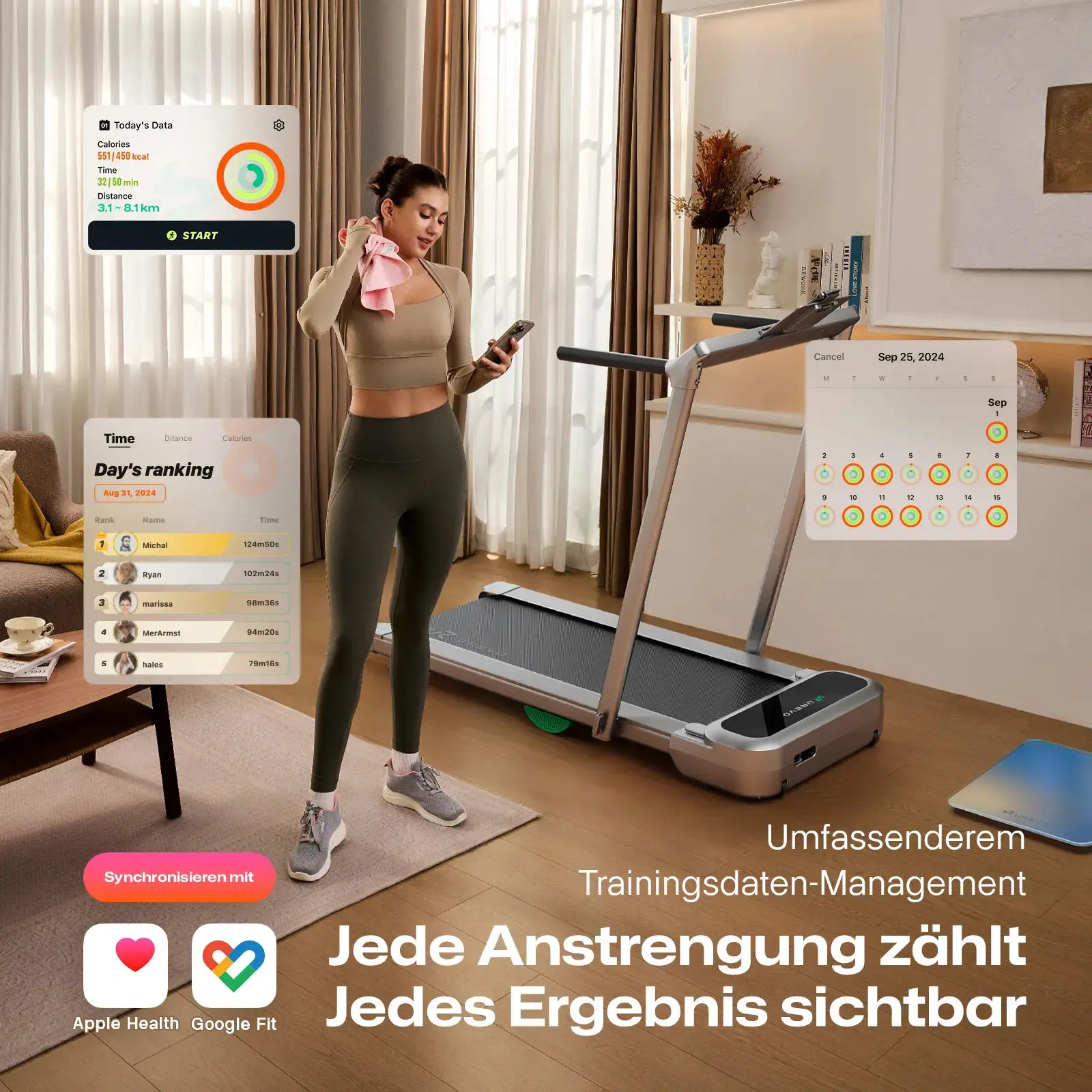- SwiftFold™ 2-in-1 Walk & Run Laufband: Wählen Sie den Gehmodus für Ihr morgendliches Training (1-6 km/h), um energiegeladen in den Tag zu starten, oder den Laufmodus (bis zu 13,4 km/h) für effektive Fettverbrennung. Perfekt für die ganze Familie – vielseitig nutzbar und kostensparend. Ideal auch fürs Homeoffice.